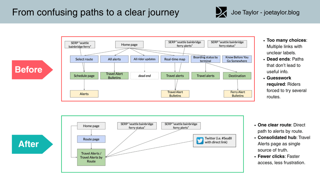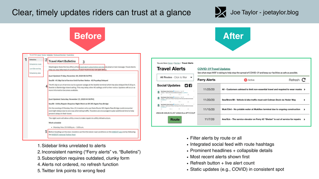 - Confusing navigation: The homepage offered overlapping links (“Ferry Alerts,” “Rider Updates,” “Live Status”).