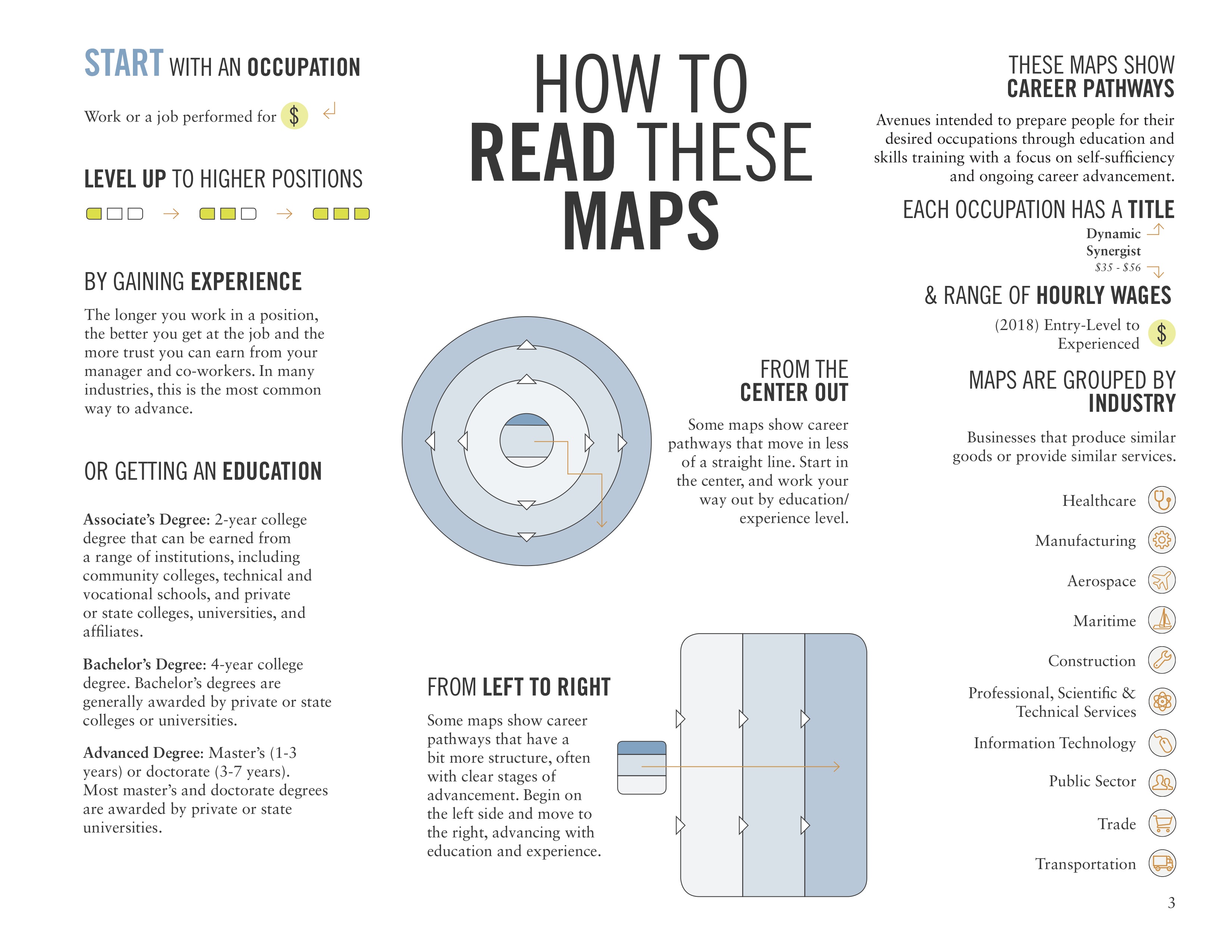 When I started, the project was nearly ten years old and on its second iteration. The data was clearly in need of an update, but more pertinently, the design was not serving the accessibility goal. The career maps were wildly inconsistent from industry to industry, presenting an overwhelming volume of detail with a lot of labor market jargon. The book was designed in PowerPoint and looked like it, and the web version was extremely minimal, mostly serving to link back to the PDF of the book.
