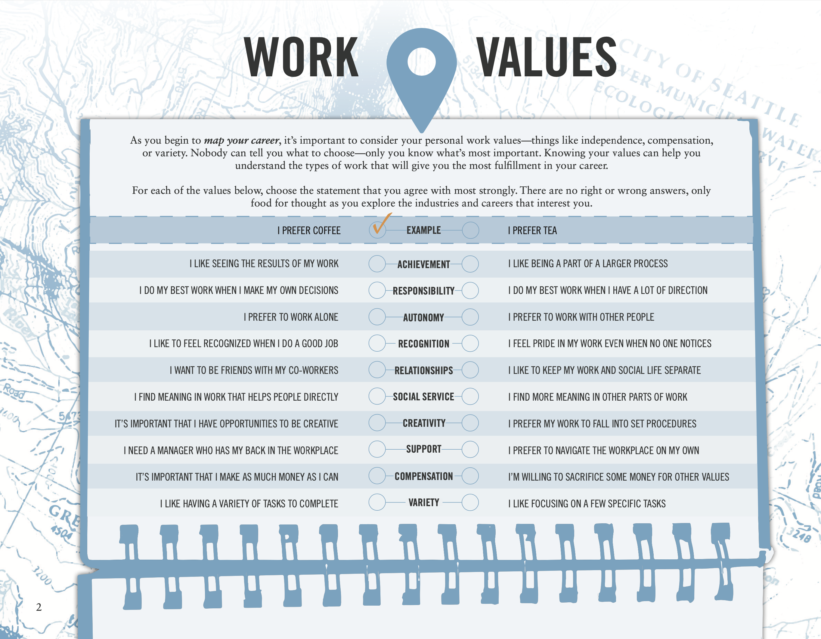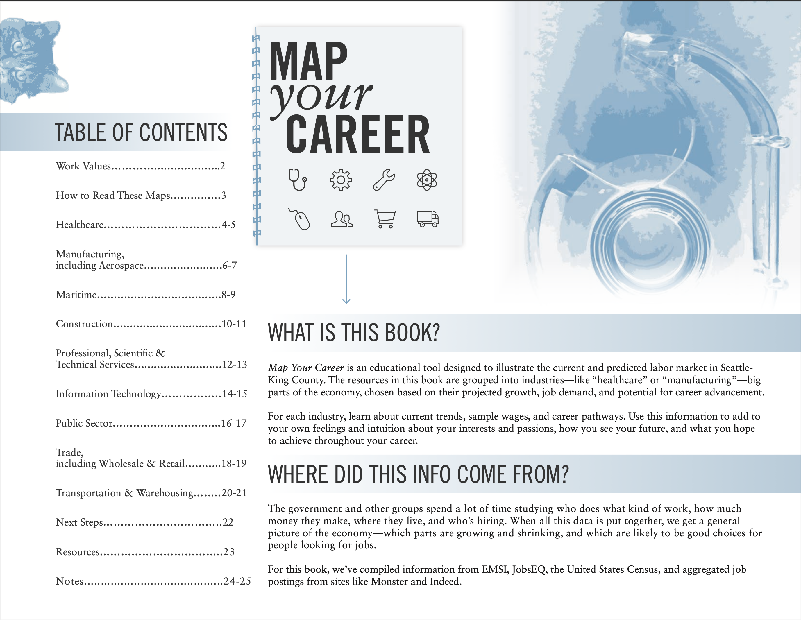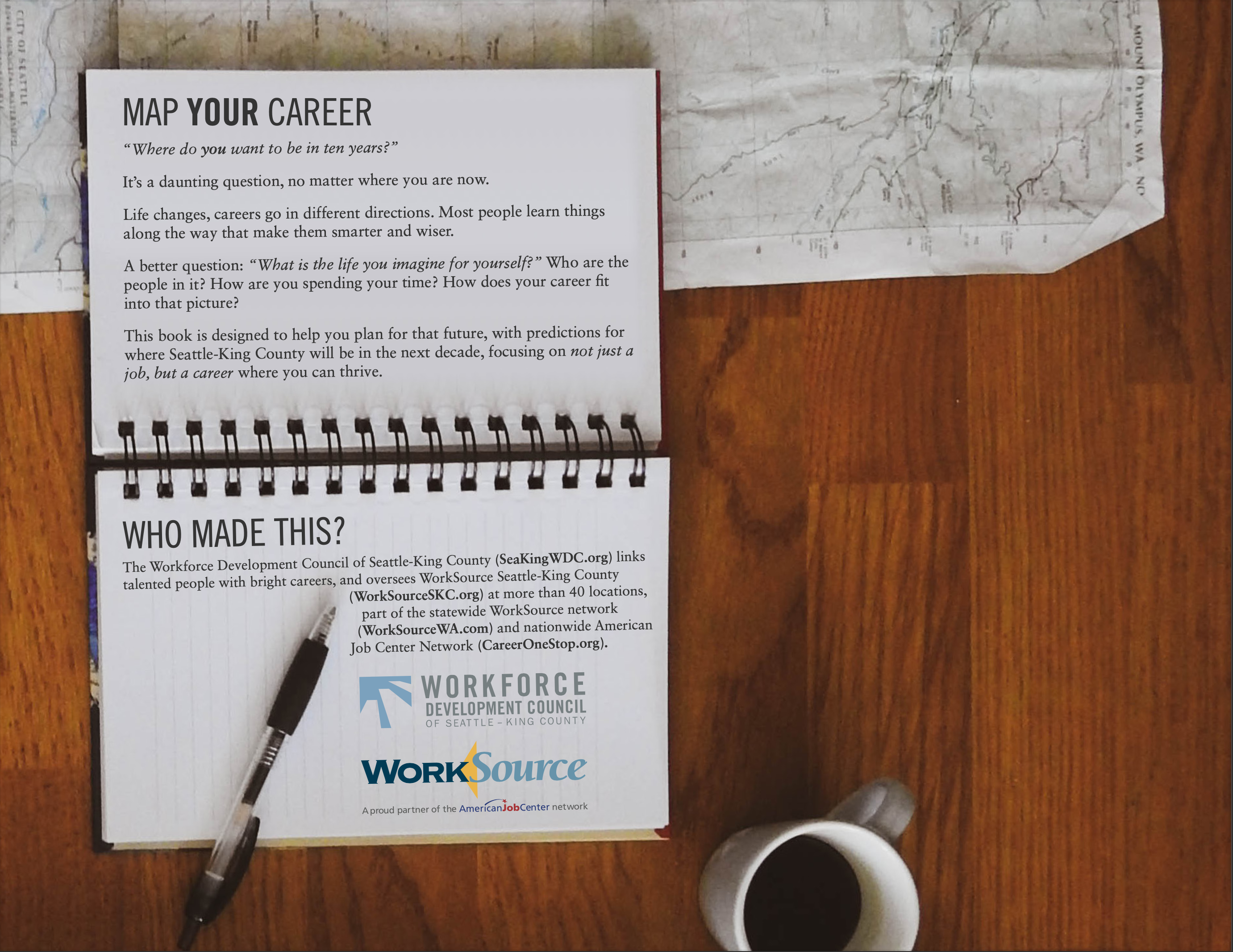 After the website was finished and the print version was ready to be distributed, we hosted a short webinar with community stakeholders to go over the process and introduce the redesign, and overall it was well-received. The print/PDF version was picked up quickly by King County classrooms, and in the two years since launch we have had to do several re-prints to supply K-12 educators. For the web version, a happy trend has emerged: the Work Values worksheet regularly leads web traffic alongside the major industry pages, indicating the classroom resource is being used as we had hoped.