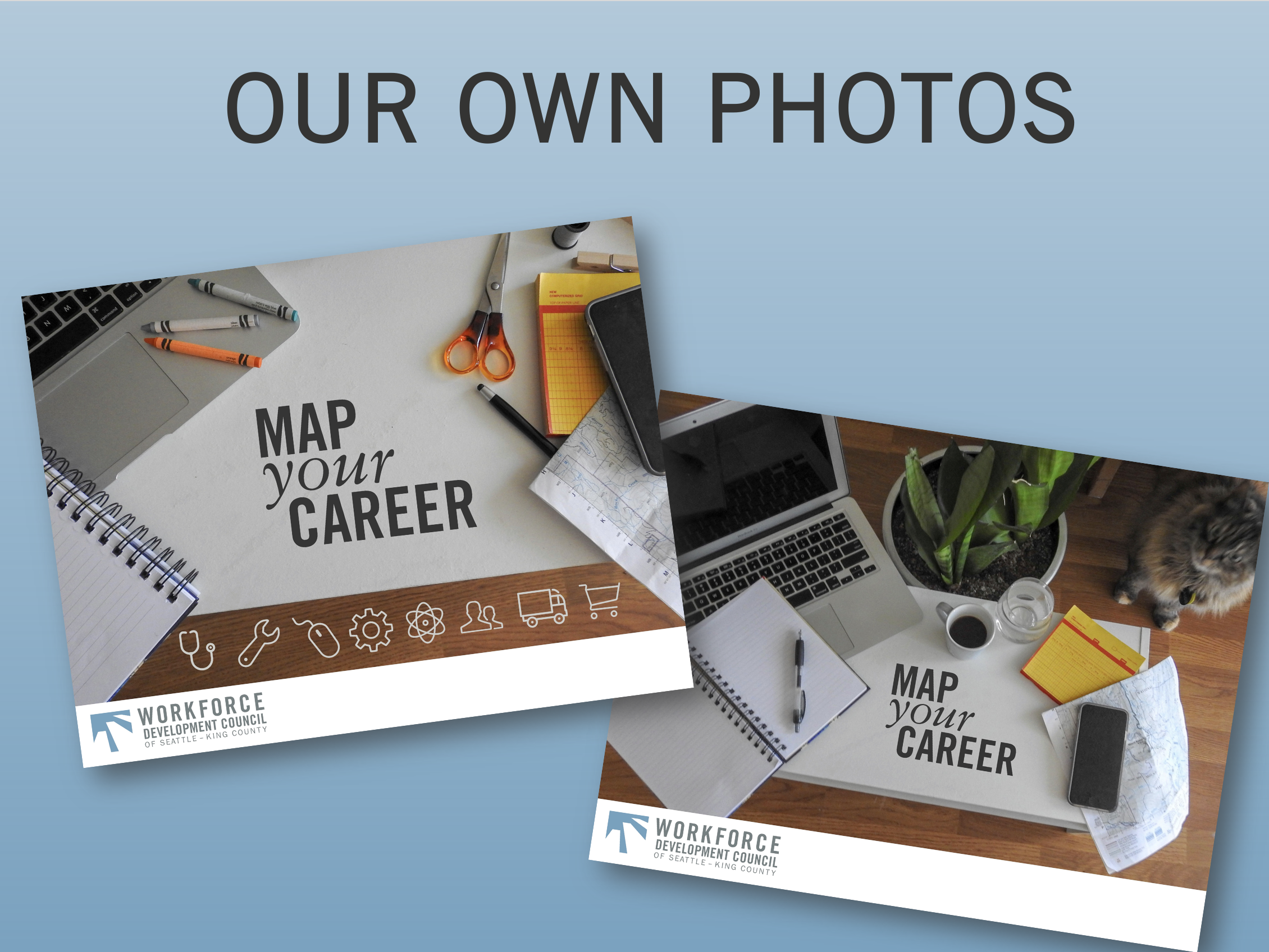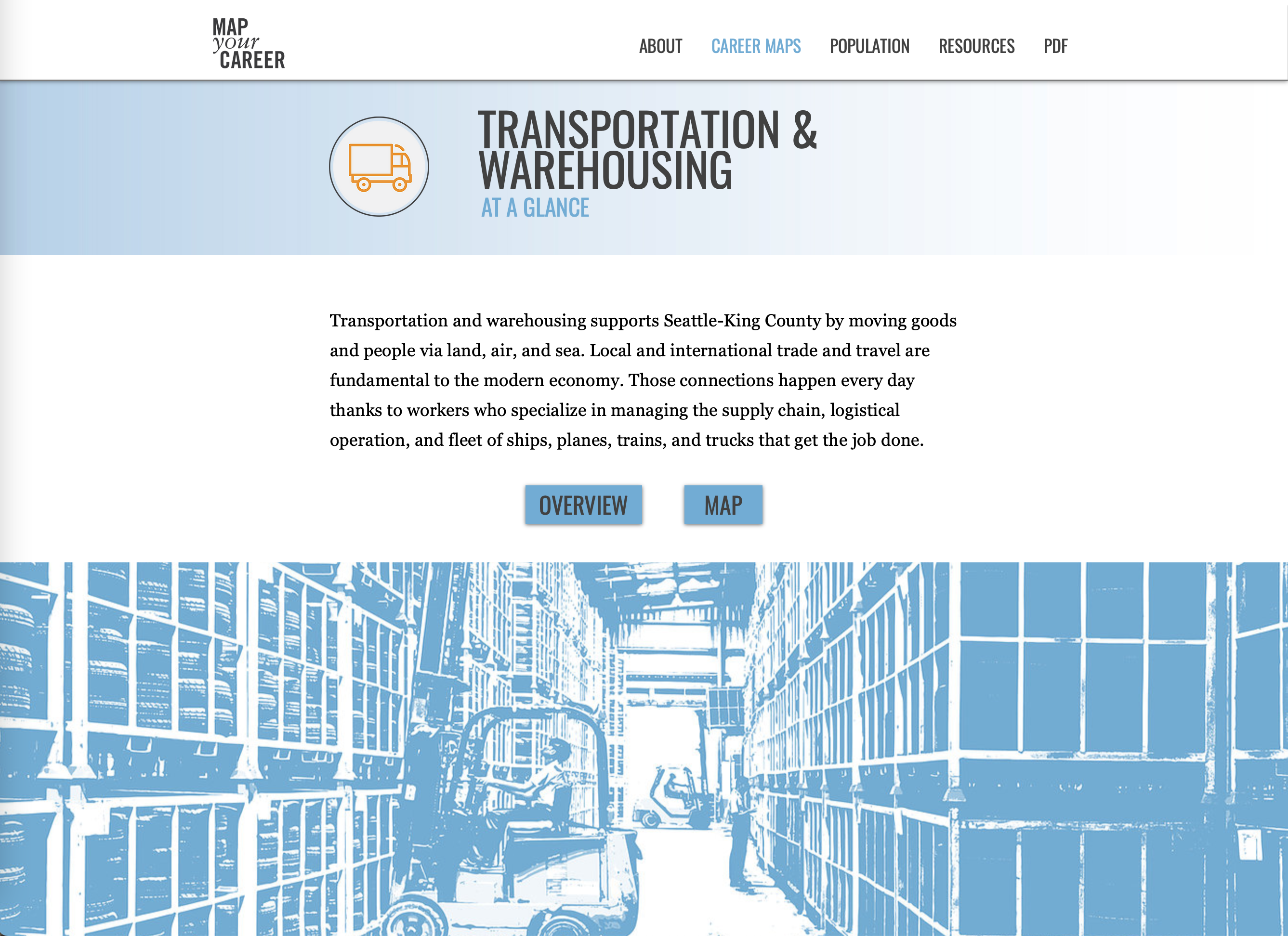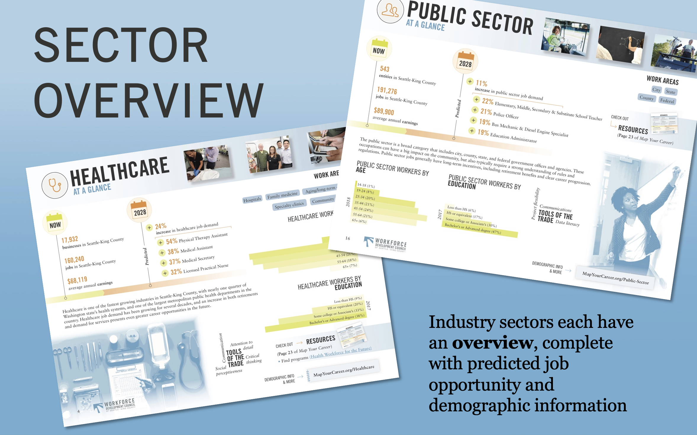 After the website was finished and the print version was ready to be distributed, we hosted a short webinar with community stakeholders to go over the process and introduce the redesign, and overall it was well-received. The print/PDF version was picked up quickly by King County classrooms, and in the two years since launch we have had to do several re-prints to supply K-12 educators. For the web version, a happy trend has emerged: the Work Values worksheet regularly leads web traffic alongside the major industry pages, indicating the classroom resource is being used as we had hoped.