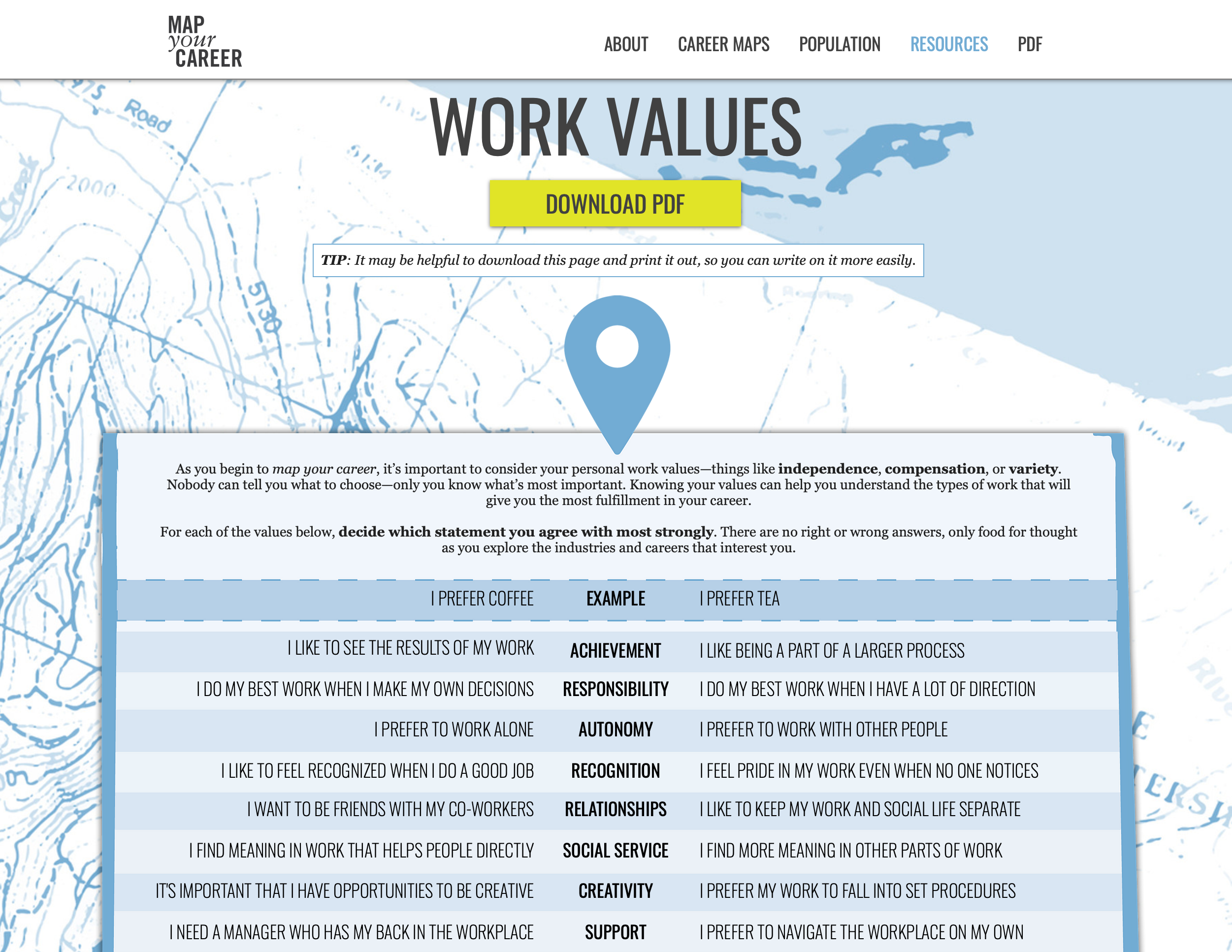 Because of the focus on a school-age audience, it was important for Map Your Career to include an exercise that could be used by a classroom instructor to facilitate discussion. The previous version had included an activity worksheet composed of blank fields to fill in a career pathway “ladder.” This reinforced the linear pathways we were trying to get away from, so instead we opted to build a series of values-based exercises with a focus on starting conversation in a classroom and building good job search and networking strategies.