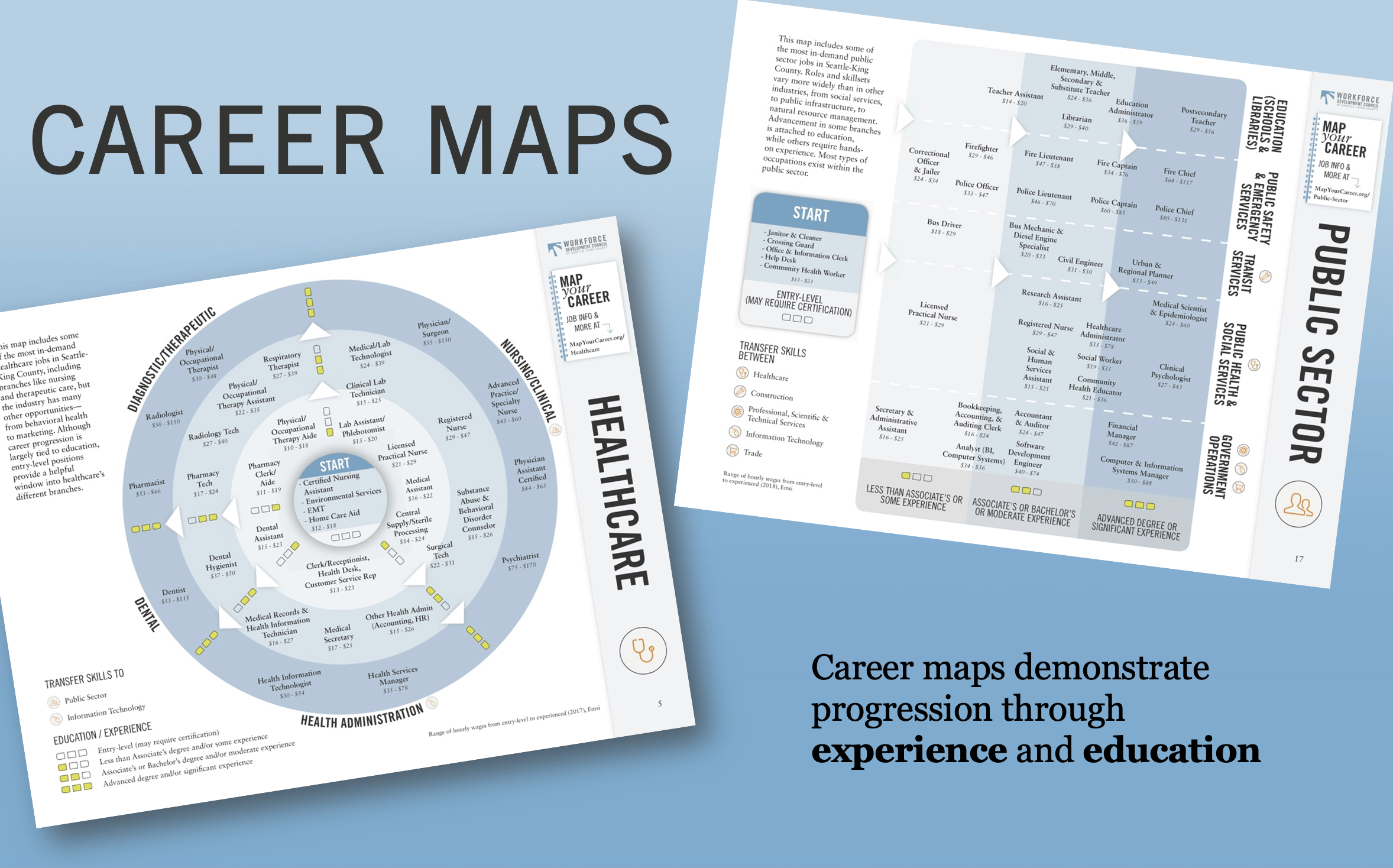In addition to schools, trade groups representing healthcare, maritime, and manufacturing have adapted versions of the maps to guide their own internal advancement pipelines. Map Your Career was beta-tested inside healthcare organizations to identify best practices for internal worker advancement, sparking an ongoing conversation and shared planning between smaller healthcare providers around medical assistant apprenticeships.