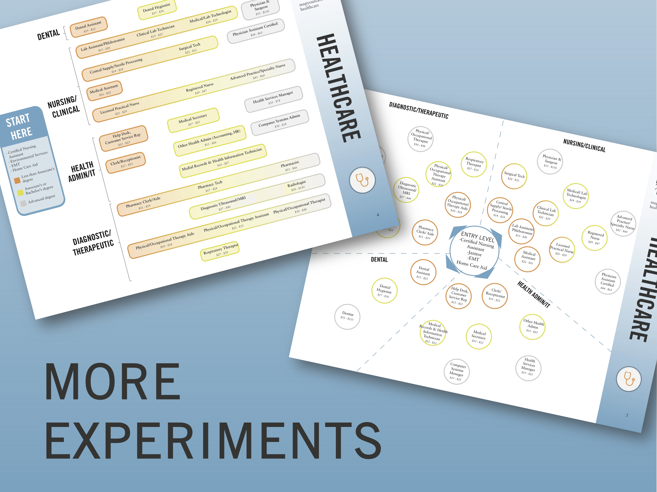 In addition to designing the maps themselves, we also needed to create summaries to reflect high-level data about an industry that made it viable for someone looking to start or change careers, using 10-year labor market estimates as a guide. For these we incorporated simple approaches to showing relevant data and decided to omit some data which was better viewed in an online dashboard. I created stylized images to complement the abstract maps, and to ground each spread in a visually distinct portrayal of the work environment. These details may seem superfluous, taking up valuable printed space, but they provide a cohesion to the project and lend well to the web adaptation.
