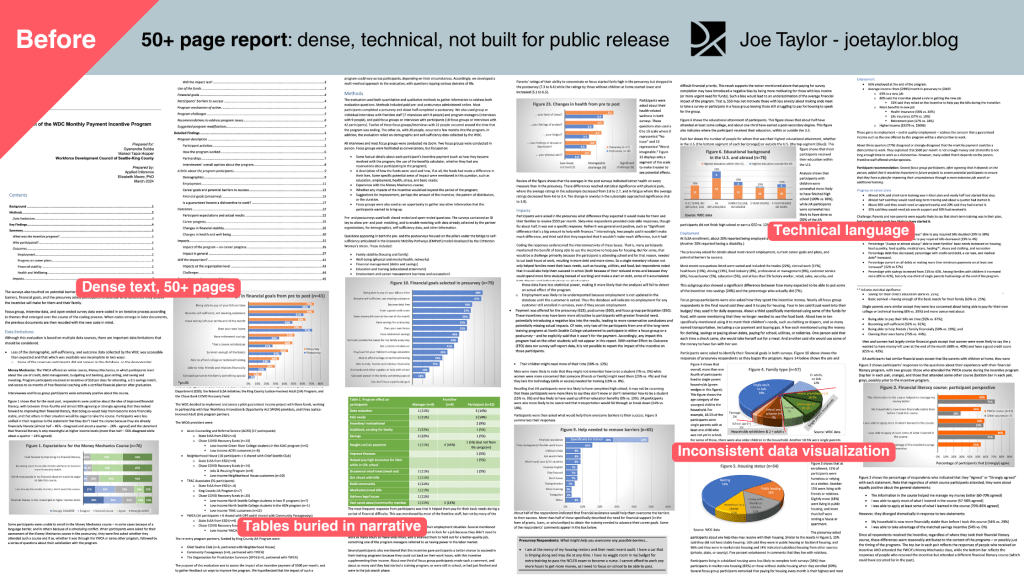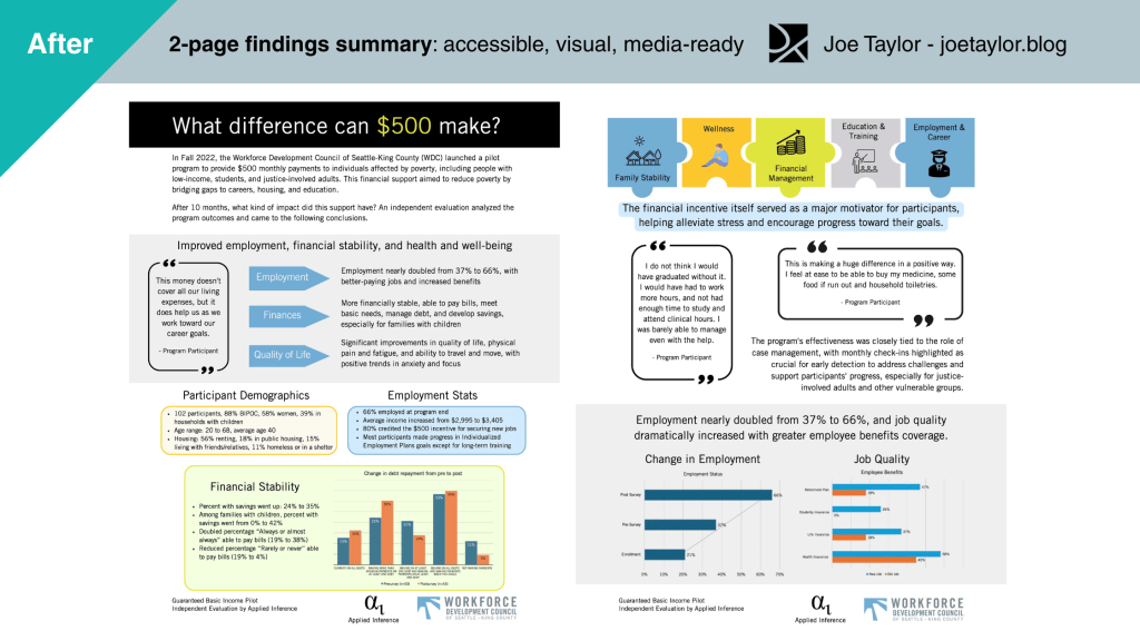 In 2024, the Workforce Development Council partnered with an independent researcher to publish results from a groundbreaking pilot combining direct cash assistance with workforce interventions. The study had powerful findings, but the report I received had not been created with public release in mind (and now it was my job to “make it work”).
