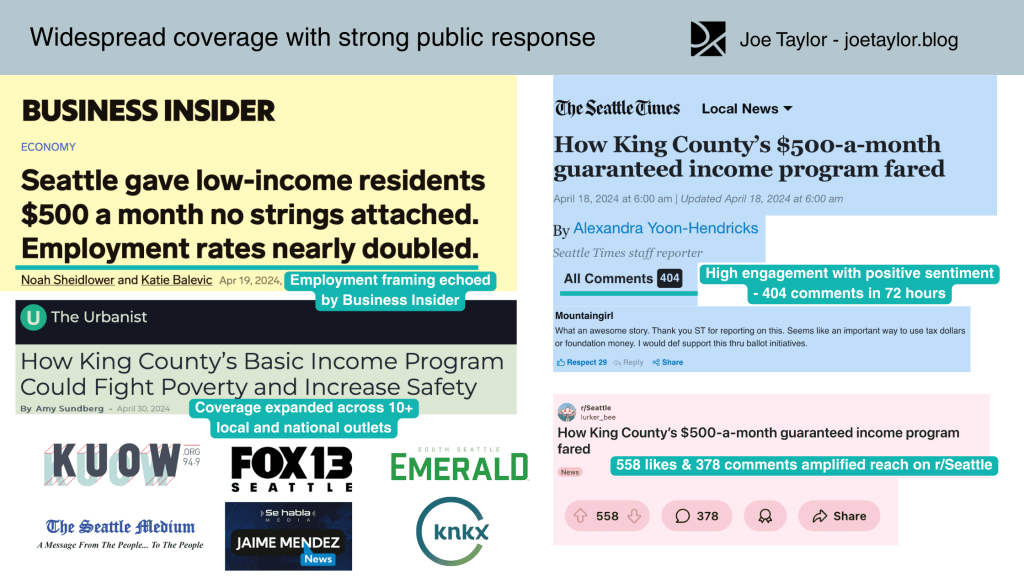 This project showed how a carefully framed release strategy can transform a dense research report into a catalyst for public dialogue, funding, and credibility. By balancing the integrity of independent research with a communications lens, I helped ensure innovative program results broke through in the media and contributed to shifting the narrative on guaranteed income toward one of work, dignity, and opportunity.