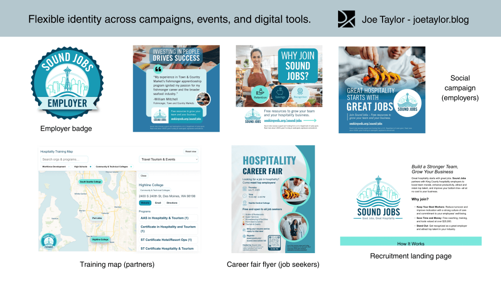 The Sound Jobs identity now adapts seamlessly across outreach, events, and parter tools. Even in cases where program plans shifted, the brand remained consistent and ready to deploy.